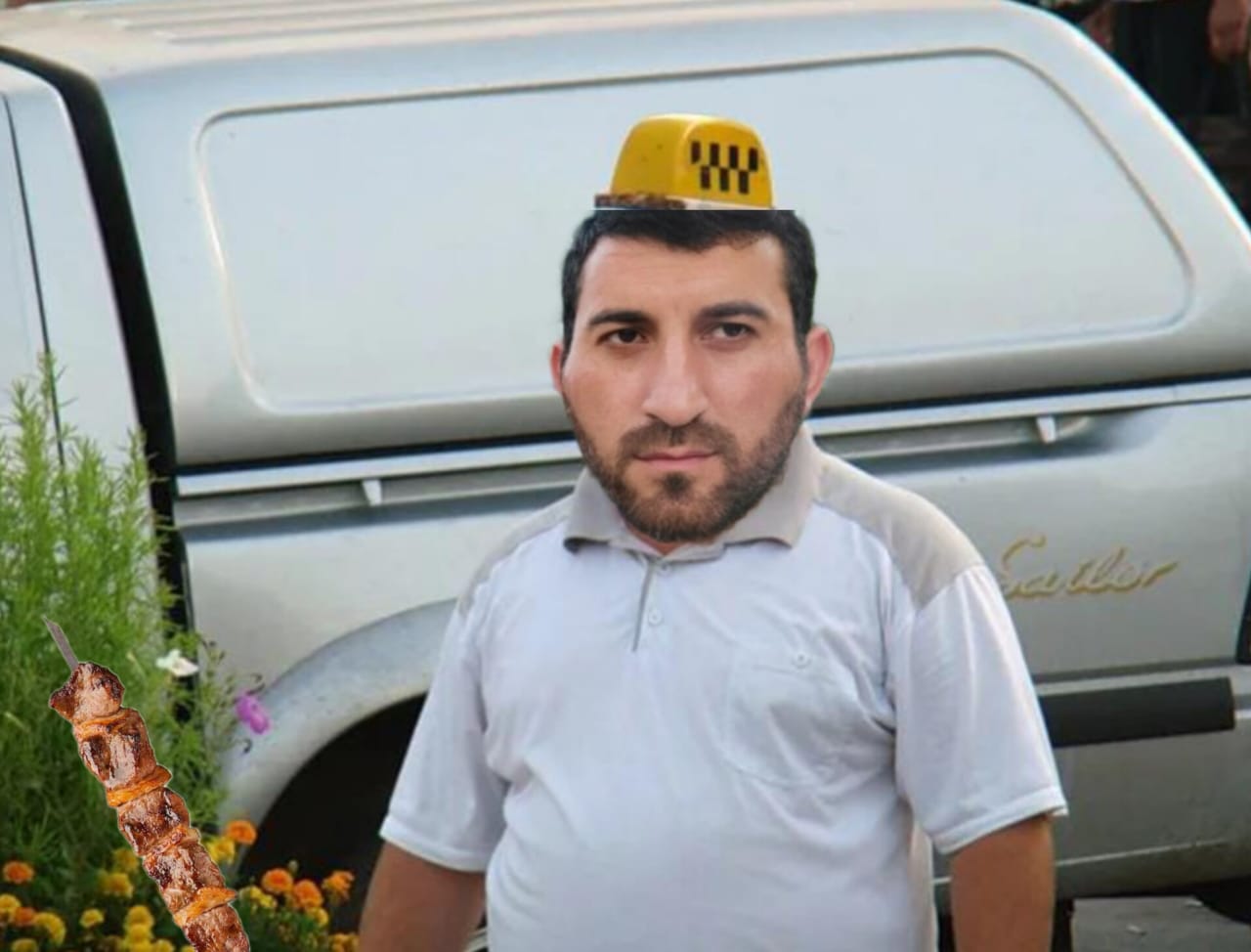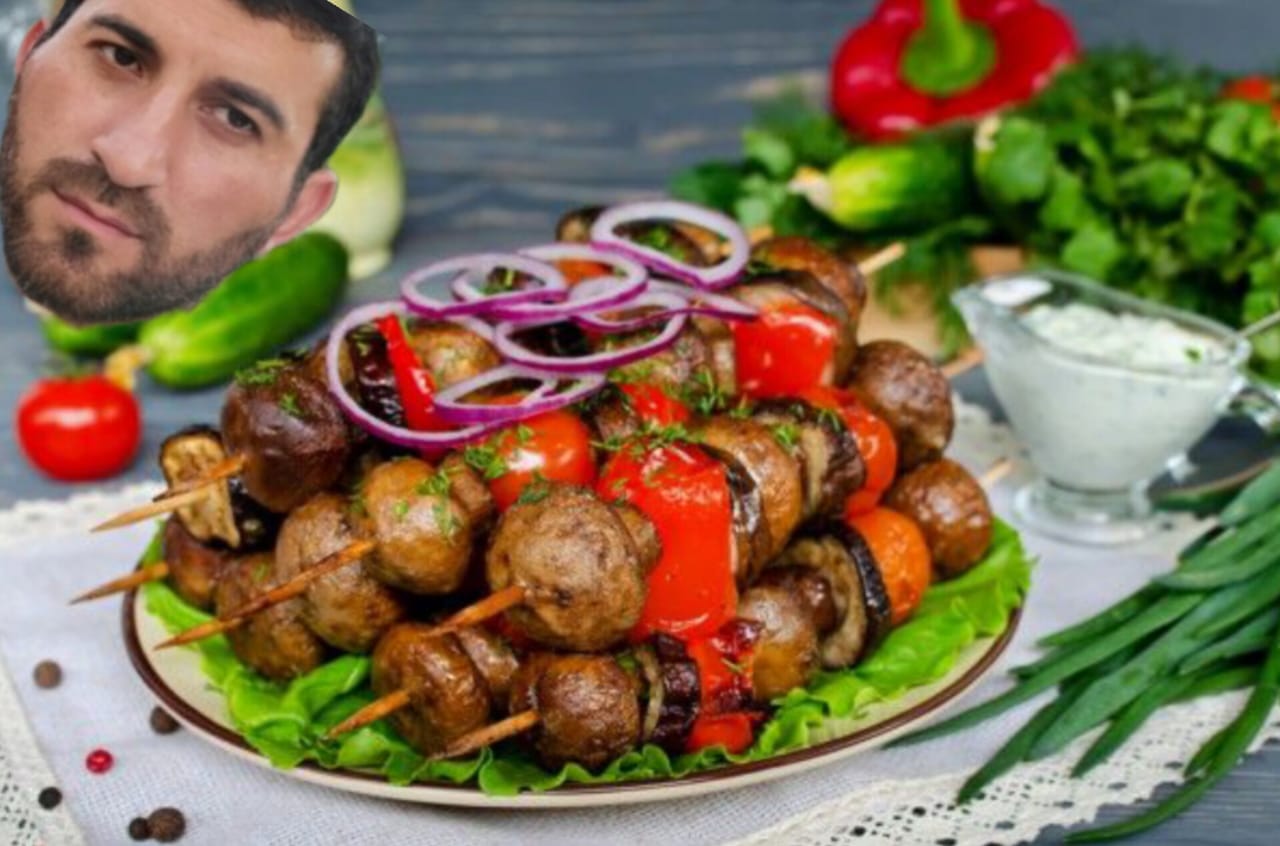 Подсказка №3 для всех (17 минут) "Шашлыки от Натига", ул. Театральная 234в. На фото изображён Натиг. В подсказке Натиг с шашлыком.